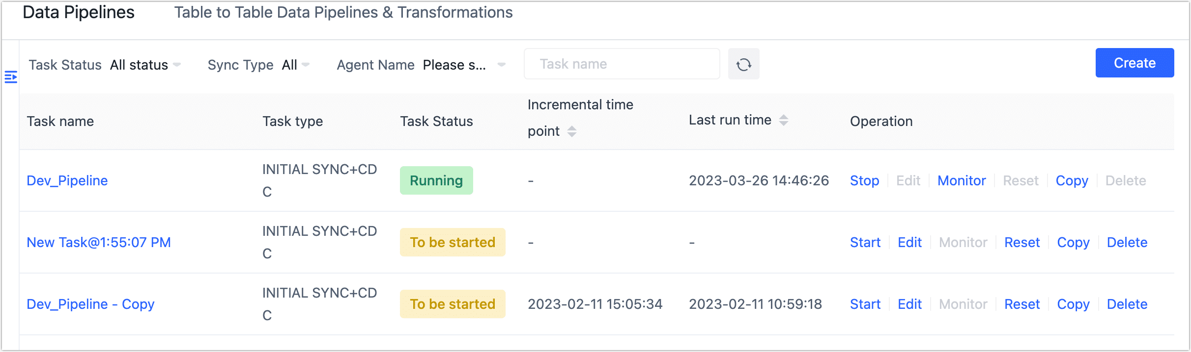 | Start/Stop | After stopping the task, the next start will continue to replicate the data based on the last stopped incremental point in time. |