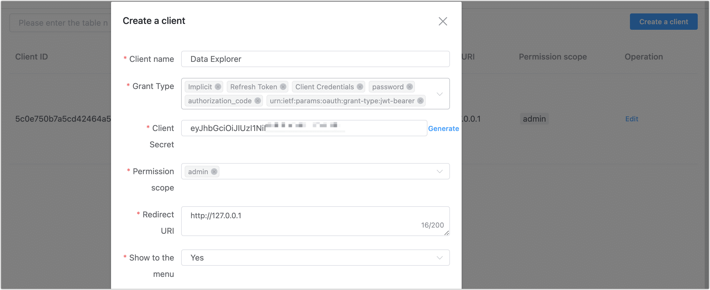 Client Secret: Auto-generated credential used by the client to authenticate. Click Generate to create one.